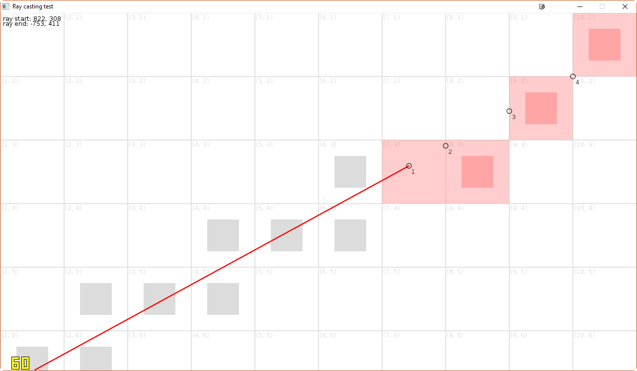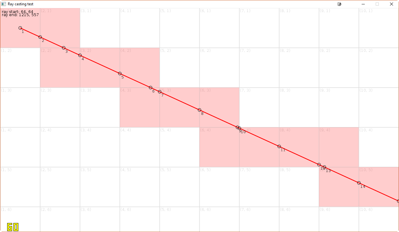Even if often times this is sufficient, it is never perfect in the sense that this method finds all cells that intersect with the ray and with finite dt, there will always be corners that could be overstepped. An example of this from the example löve program (function castRay_naive) can be seen in this screenshot: