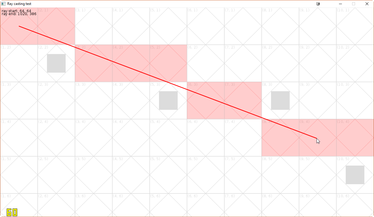 This might seem like the obvious choice and depending on your game (or the problem at hand) it might very well be, but in general this is also not sufficient, since these algorithms operate in (in our case) tile coordinates only, so that there will be no difference in a ray connecting the upper left corner of a tile and the lower right of another tile and a ray connecting the lower right corner of the same, first tile and the upper left corner of the other one. In fact most commonly line rasterization algorithms will rasterize every pixel, when a diamond shape in the pixel’s center intersects the line connecting the centers of the start and end pixel (the “diamond rule”). An example of this, including a visualization of the diamonds mentioned before, can be found in this screenshot (also from the example program, which has both DDA and Bresenham available):