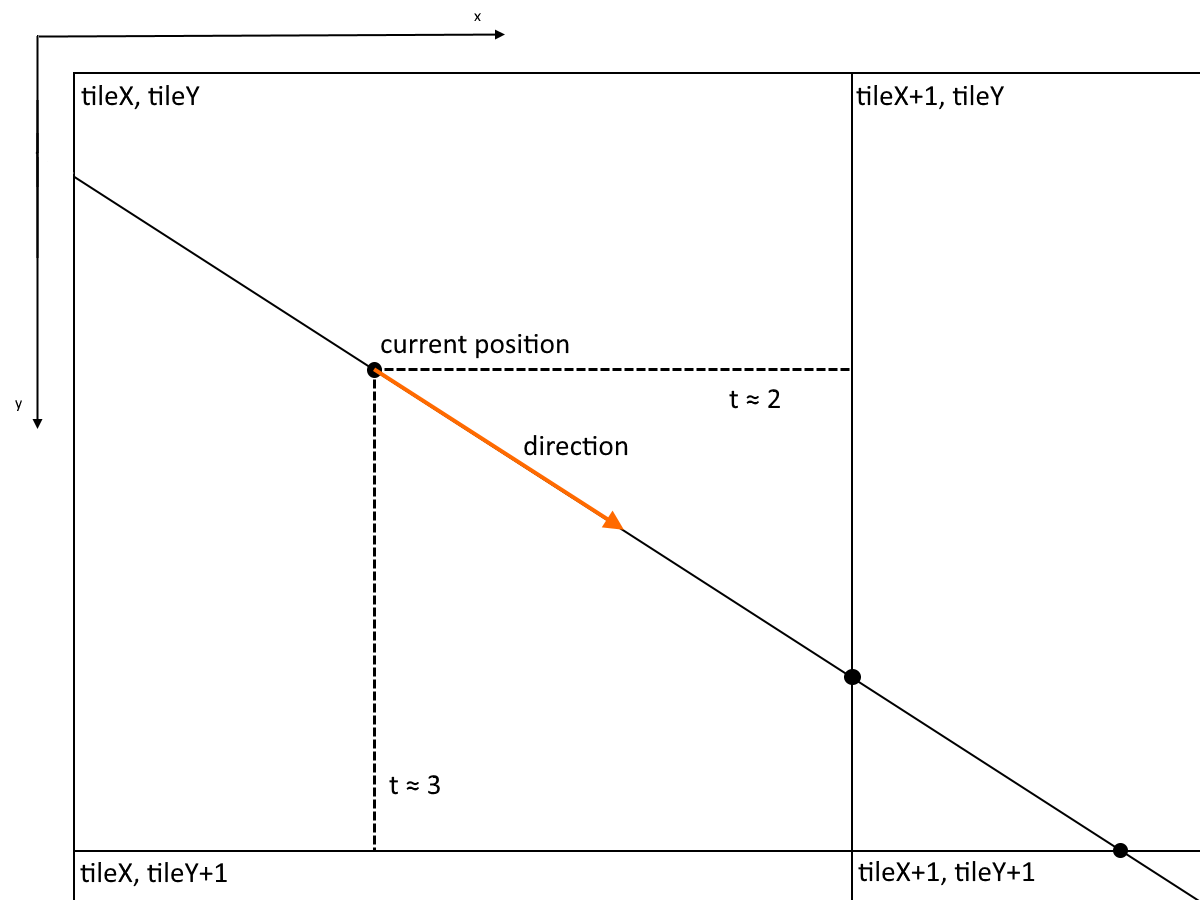 The floor-problem has multiple ways to solve it. One would be to rewrite our floor function so that it takes an additional parameter, which indicates which side of the interval should be open (i.e. not include the integer). Another one is to add an epsilon to our t, when incrementing it by either dtX or dtY, so that we will barely sneak into the next cell. Choosing this epsilon is a little tricky though since by introducing it, our algorithm will start to have edges it could overstep, just like the naive method. Any non-vanishing epsilon will have this as a result and even if we make it really small (of the order of a screen pixel size), we might run into issues when it just disappears because of floating point normalization, when ray casting in really big grids. This method might then resemble a naive method, with a really small step, which intelligently skips some samples, if possible.