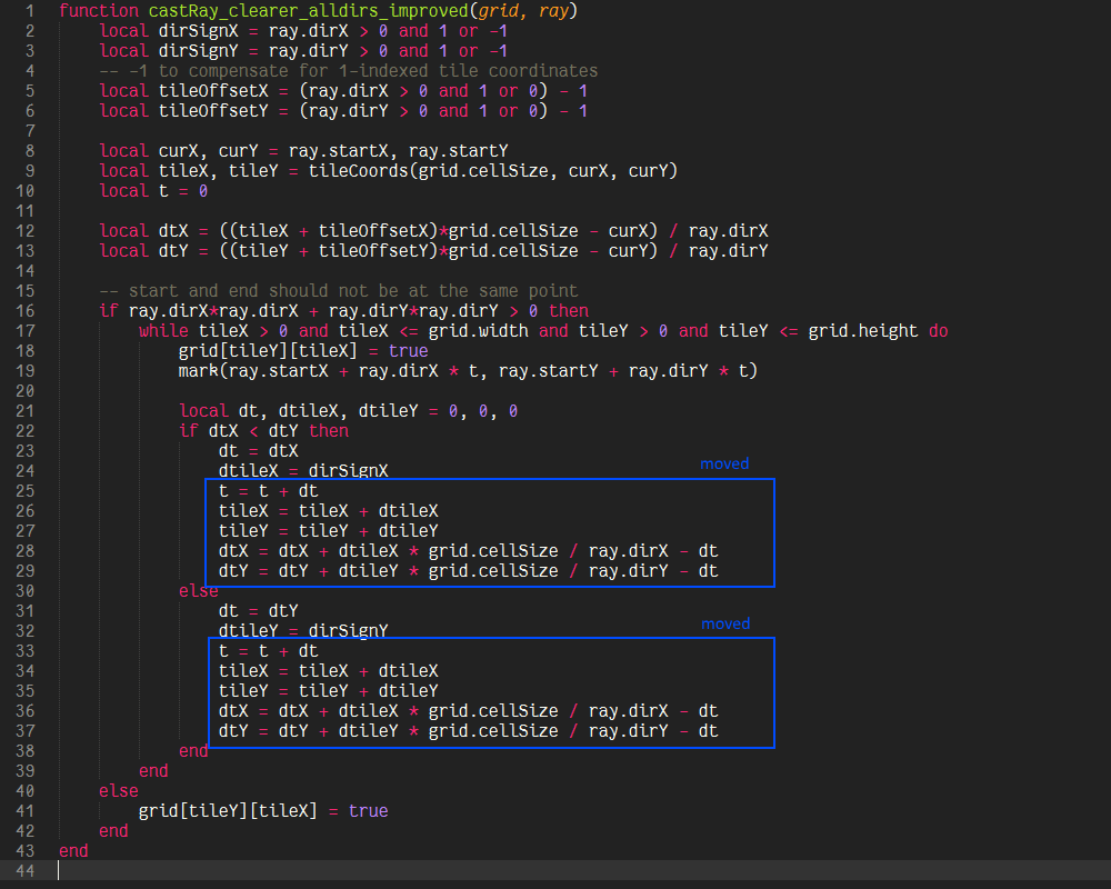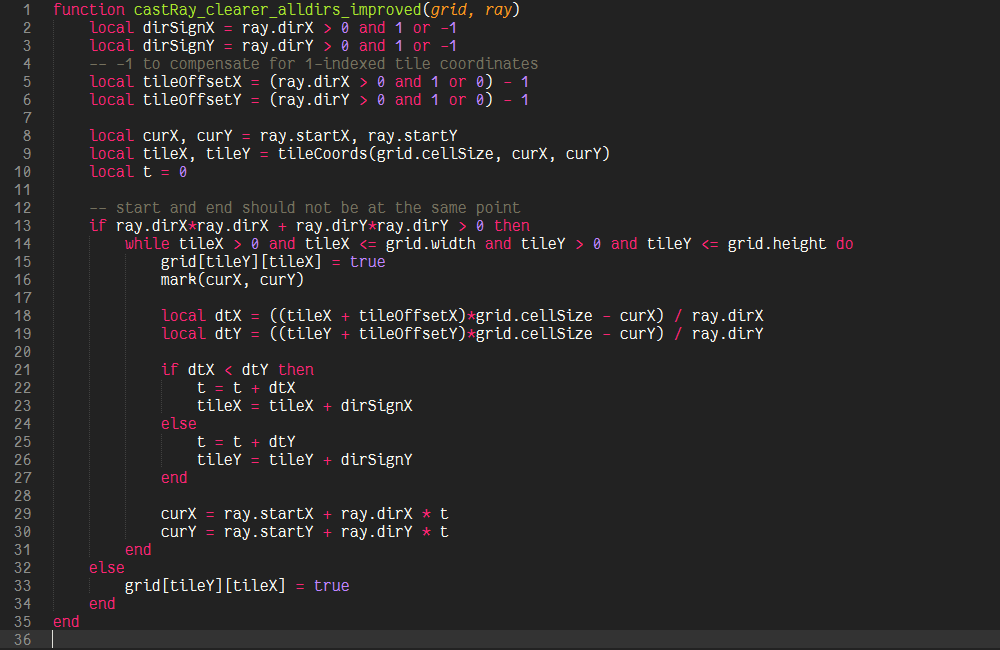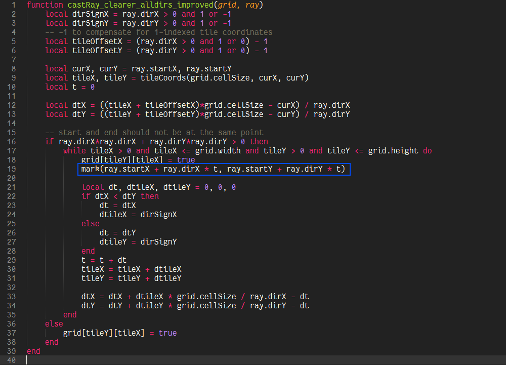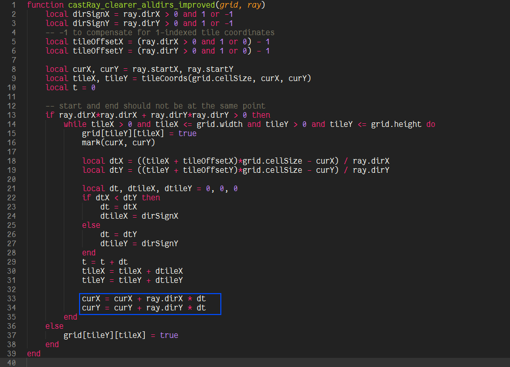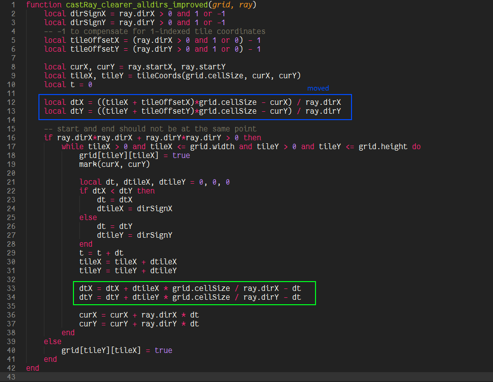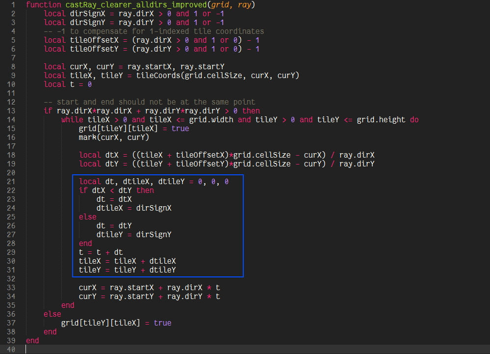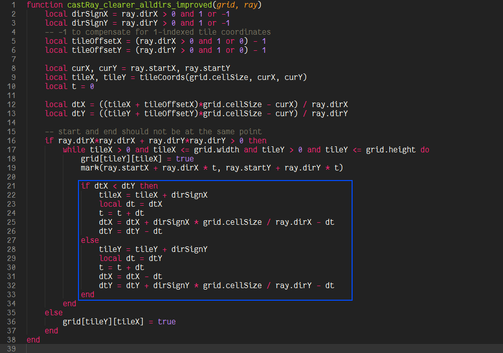 One branch and 5 additions per step and a setup function (a little trickier though, but constant time) is probably as good as it can get, though it is definitely not as apparent what is actually happening in this function. If we decide that we have no use for t and therefore the intersection points themselves (and just want to visit some cells, or want to know if there is a possible path at all), then we can eliminate t all together and because we don’t care about the actual values of dtX and dtY, we can decide to omit the “- dt” term, because the comparison in the next iteration will still yield the same result, so that our algorithm would be reduced to one branch and two additions. This is in fact the algorithm described in “A Fast Voxel Traversal Algorithm for Ray Tracing” by John Amanatides and Andrew Woo, which inspired the transformations done to castRay_clearer_alldirs_improved.