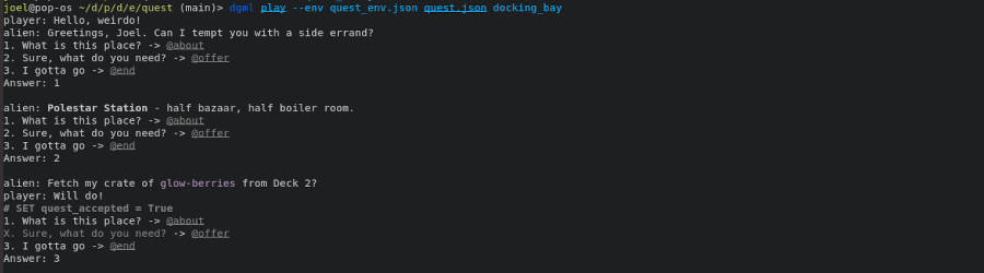 dgml is a toolkit for authoring and managing dialogue trees with plain text files and CLI tools. There is a DGML markup language for dialogue trees, a couple of tools for metadata (like localization). It compiles all the dialogue to a single JSON file or a custom binary format that is built in such a way that writing a runtime is as easy as possible. There is a Python runtime, a C runtime and a Lua runtime.
