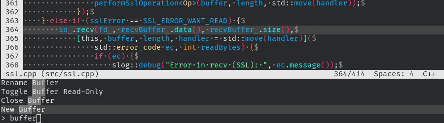 There was a time at work when our graphical interface was not working properly and I had to use vim for a few weeks. A few years earlier I spent a good half year with a vim cheat sheet in front of me to learn vim and concluded that I would never be as fast at editing text with it than I already am with Sublime Text. Since there seems to be a dire lack of an editor of the TextMate family (to which Sublime Text belongs as well) for the terminal, I decided to try my hand at it. This editor is not intended to be used by anyone else but me, so it can be fully tailored to my needs without compromises. It has multiple buffers, a command palette, C++ highlighting using tree-sitter, find and various cursor movements and I already use it for small editing jobs here and there, but some major features are missing to switch to it, which I have not gotten around to yet.