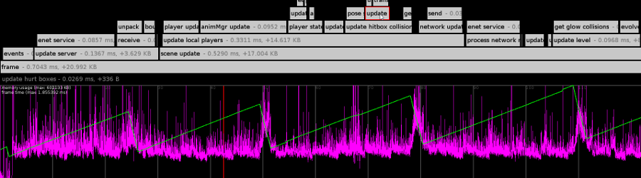 Usually Lua programs are profiled by setting hooks using the built-in function debug.sethook, but sadly these hooks are not reliably called in LuaJIT, which makes most profiling libraries for Lua not usable in the current version of löve. jprof is a semi-makeshift solution for profiling löve applications with some extra work, but while also providing no significant slowdown while profiling. It is probably the piece of software of mine that is most used by other people.