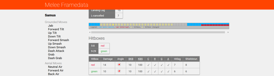melee-framedata is a website with in-depth frame data for Super Smash Bros. Melee, inspired by the move pages on SmashWiki. It is split into subprojects, meleeDat2Json and meleeFrameDataExtractor. First the character files are extracted from the Super Smash Bros. Melee disk image using gciso. Then those character files are parsed and dumped to JSON files using meleeDat2Json. These character files include small scripts for each move, called “subactions”. The subactions are then processed to extract high-level information such as move-length in frames, hitbox creation, change and removal times, and so on. Finally this data is converted to tables and diagrams describing the move (example: Samus Neutral-Air). To record the clips on the move pages I patched a Super Smash Bros. Melee disk image to color the hitboxes in the game’s debug mode according to my choice. meleeframedata.com bases their data on my work (see their Info section under “Data Sources”). I consider this one of the coolest things I have made, though it is hard to understand for most people what it is or why it is cool.